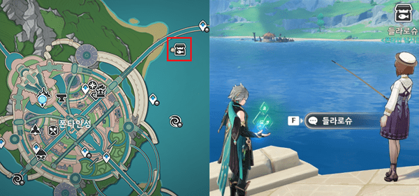 용압철갑 제왕이 있는 폰타인 흰 이슬 구역 워프를 타고 이동해줍니다.